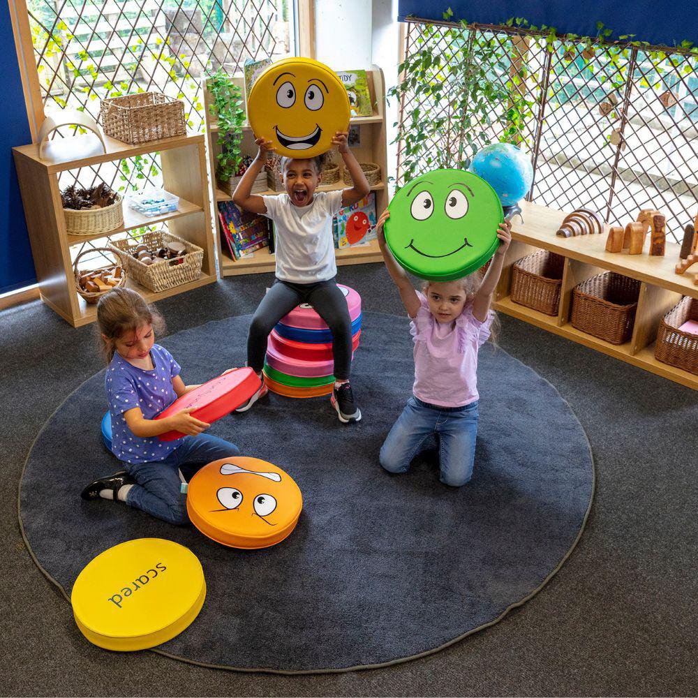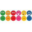 Pack of six cushions with facial expressions printed on one side, and English descriptions on the other.