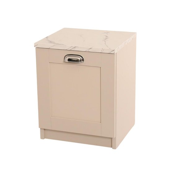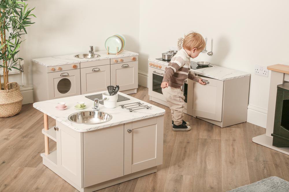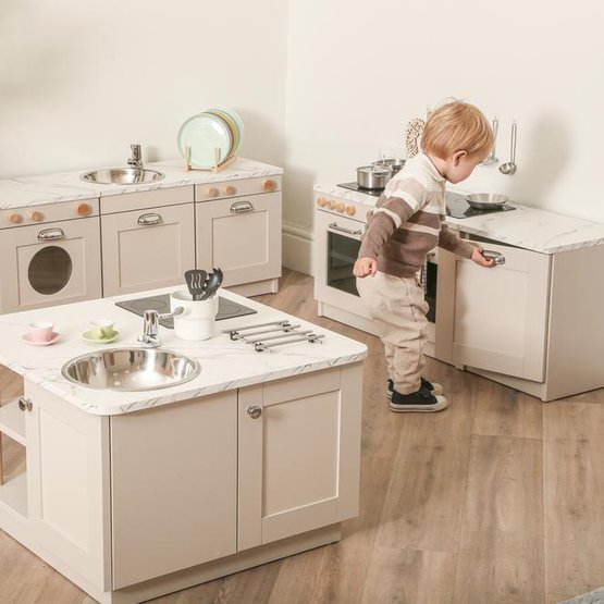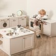 Beautifully designed play fridge, created to offer a realistic and stylish addition to any playroom, preschool, or Montessori learning environment. Crafted in a soft, neutral beige tone, this fridge features a modern, minimalist aesthetic that blends effortlessly with both contemporary and classic play kitchen sets. The top surface showcases a premium marble-style finish, giving the appliance a polished, high-end appearance that elevates imaginative play.