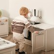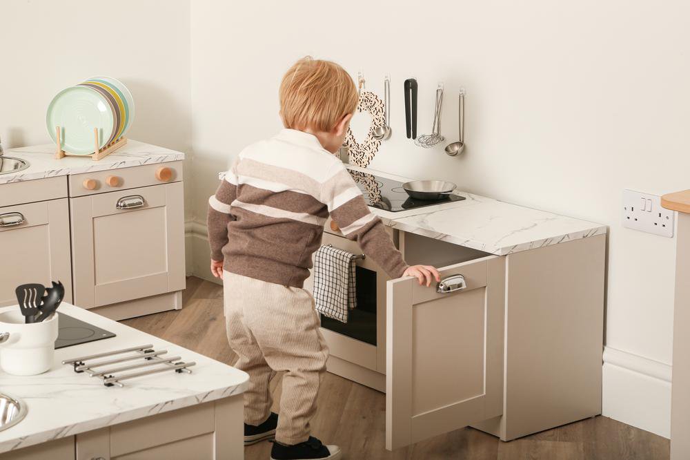 The front panel showcases a polished chrome-style handle, mimicking the look of a real refrigerator door and making it easy for little hands to grasp and open. Inside, the spacious compartment is ideal for storing pretend food, snacks, play kitchen ingredients, and dishes. Designed with soft closing hinges to prevent finged traps.