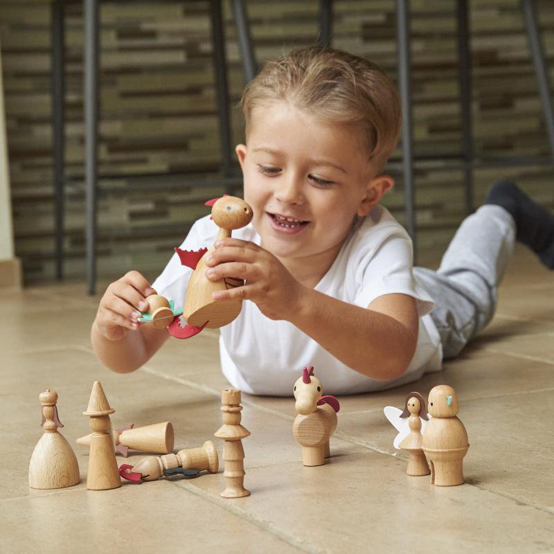 Fun, detailed solid beechwood characters from traditional fairy tales and stories. With faux leather detailing in a range of bright colours. The set includes a king, queen, witch, wizard, fairy, knight, dragon, unicorn, frog prince, ogre and a cotton drawstring storage bag.