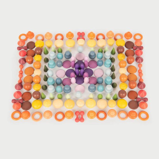 A beautiful set of smooth wooden shapes inspired by nature and discovery. Each treasure shape comes in 3 shades of 7 organic colours symbolising emotional characteristics and the senses. There are two colour versions of mushrooms / nelsons and stones / tokens.