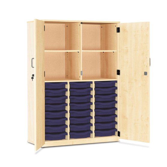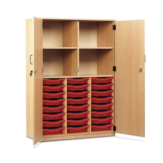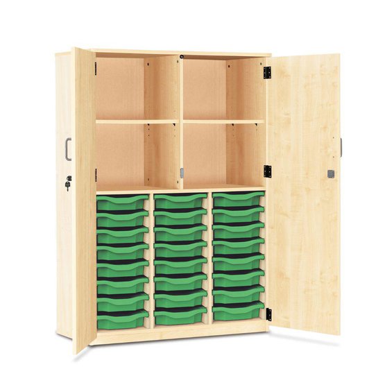 24 Shallow Tray Cupboard with Full Locking Doors, enclosed by two hinged doors, it features four spacious compartments for storing larger items. Each door has a locking mechanism for security. Lower section: Contains three vertical columns for trays which are available in 23 different colours.